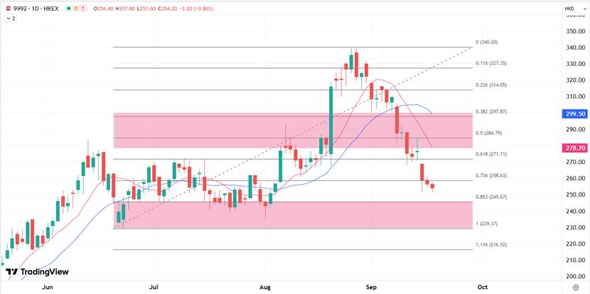 XM Hong Kong Stocks: Pop Mart (09992.HK)'s stock price has been falling all the time recently, with a cumulative decline of 24% since the end of August. It showed its biggest drop since April on Monday, with a sharp drop of nearly 9% in session, the largest drop in five months. The current stock price has hit the lowest since early August, corresponding to institutions' downgrading expectations of ratings, which has intensified people's concerns about the decline in the www.xn--xm-5s9cx14e.company's product popularity.