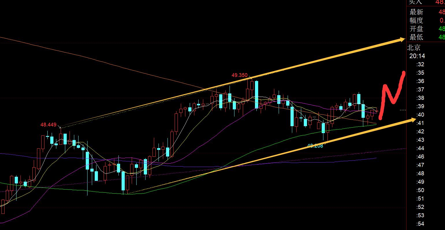 Second, in terms of silver: for silver, the daily level is the mid-track suppression of 49.45, and the resonance support on the 5th and 10th is at 48.2, so it is also in the midst of shocks; from the picture above, there is also a yellow upward channel, and the lower track supports tonightPay attention to 48.5-48.6, the hourly middle rail has also broken through, and the trend is similar to gold. It tends to stabilize the middle rail and rebound upward, then rush higher and fall back, slowly grinding into the upward channel;