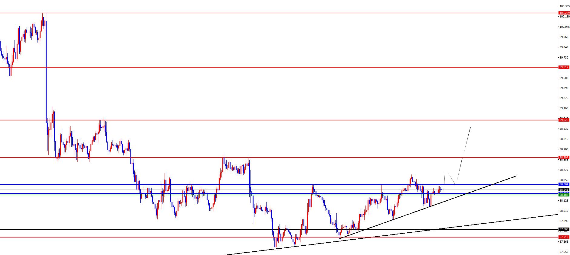 De un análisis de ciclo múltiple, el nivel semanal ha sido recientemente respaldado por el soporte semanal de arriba y hacia abajo. Esta semana, el enfoque está en la posición 98.30 para estabilizarse. Una vez que se mantenga firme, los toros de mediano plazo continuarán aumentando. A nivel diario, el precio suprimió la posición de resistencia diaria la semana pasada y continuó fluctuando por debajo de la posición de resistencia diaria. La resistencia diaria actual está en 98.20, y actualmente está fluctuando en esta área. Prestaremos atención a más avances y aumentos en el futuro. Desde la perspectiva de cuatro horas, el período de cuatro horas es la clave para nuestro énfasis en las tendencias de precios a corto plazo. Actualmente, el precio aún está por encima de 98.20 para el soporte de cuatro horas, por lo que todavía es relativamente largo para el corto plazo. Desde la perspectiva de una hora, puede ver que puede ver que a corto plazo, primero debe prestar atención al apoyo del rango 98.10-20 y superior, prestar atención al área 98.60-99.