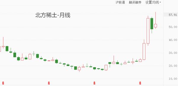 La imagen de arriba muestra una empresa representativa que produce tierras raras en el mercado de acciones A: Northern Rare Earth. En julio y agosto de este año, el precio de sus acciones subió un 50,6% y un 51,49% respectivamente. Este mes alcanzó los 61,69 yuanes, acercándose al precio máximo histórico de 62,1 yuanes. Precisamente debido a la extrema dependencia de los Estados Unidos de las tierras raras, el sector de tierras raras en el mercado de acciones A se ha vuelto cada vez más popular en el mercado.