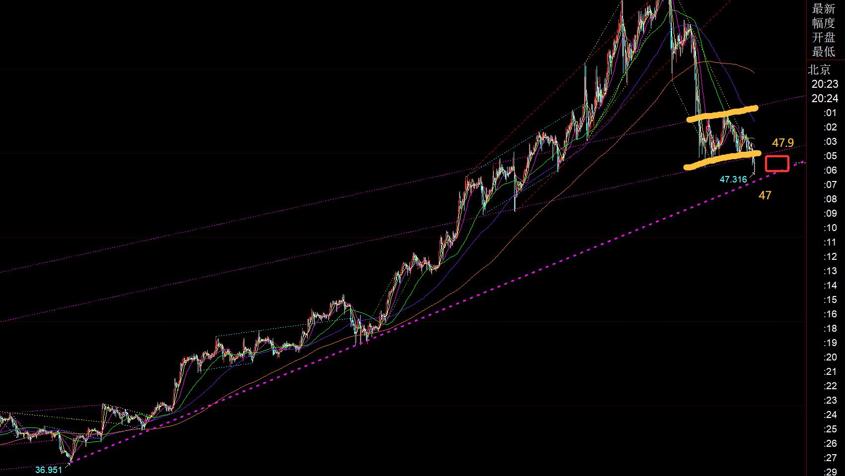 Plata: a juzgar por la imagen, el mercado europeo también rompió el rango de consolidación inferior. La línea 47,9 se llama punto de contrapresión. Si quiere caer por segunda vez, no debe atravesarlo y luego pararse sobre él. El soporte inferior es la línea de tendencia violeta que está respaldada unilateralmente por 36,95. El punto de apoyo correspondiente es la línea 47, que se estabiliza cuando se toca. Luego intente un rebote alcista; así que preste atención a la operación dentro del rango de 47,9-47 y preste atención a las ganancias y pérdidas;