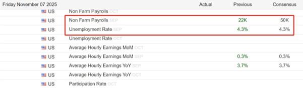 이번 금요일 21시 30분에 미국 정부 폐쇄가 종료되면 미국 노동부 노동통계국이 10월 비농업 고용 보고서를 발표할 예정입니다. 미국 정부 폐쇄가 계속되면 비농업 고용 보고서가 제때에 공개되지 않을 수 있습니다. 비농업 고용보고서가 나오면 가장 주목되는 지표는 기존 2만2000개였던 신규 비농업 일자리 수다. 앞서 언급한 값은 9월 데이터가 아닌 8월 데이터입니다. 미국 정부 폐쇄가 10월 1일 시작되고, 9월 비농업 고용 보고서가 10월 3일 발표될 예정이었기 때문에 미국 노동통계국은 이날도 폐쇄돼 예정대로 발표하지 못했다. 금융기관 기대치는 5만 명으로 기존 2만2000명보다는 높지만 평소 수준인 15만~25만 명에는 크게 못 미친다. 발표된 가치가 기대에 부합하더라도 시장의 신뢰를 높이기는 어려울 것이다. 대규모 비농업 급여 발표 시기의 불확실성으로 인해 시장의 초점은 이번 수요일의 소규모 비농업 급여 데이터에 맞춰졌습니다. 이전 값은 -32,000이었고 예상 값은 24,000이었습니다. 기대가 부정적에서 긍정적으로 바뀌었지만 절대값은 여전히 낮고 미국 고용시장 전망은 비관적이다.