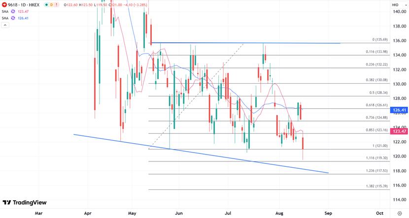 Harga saham JD.com dibuka lebih rendah dan ditutup lebih rendah selepas prestasi. Sebagai tambahan kepada seretan prestasi terkini, ia sebahagiannya diikuti tekanan ke bawah pasaran. Harga saham sekali memukul terendah sejak September tahun lepas. Secara teknikal, purata bergerak 10 hari menjadi intraday tinggi. Memberi perhatian kepada bahagian bawah HK $ 120 adalah sasaran. Jika ia jatuh di bawah, lebih banyak pesanan jualan mungkin diikuti, tetapi memberi perhatian kepada garis trend peringkat rendah dapat memberikan beberapa sokongan.