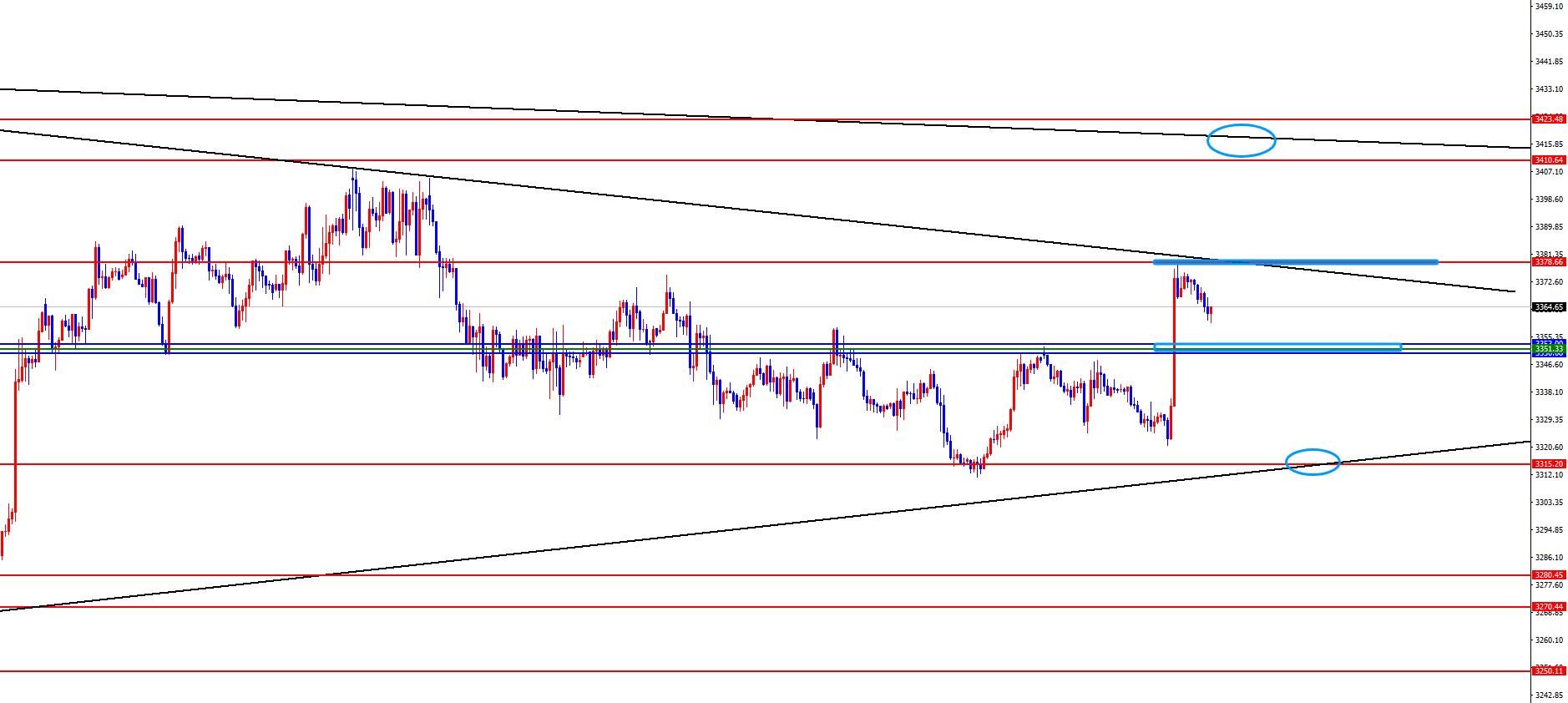 从多周期分析,首先观察月线节奏,价格在近几个月在高位持续震荡,所以在没有突破前高之前多头需要谨慎对待。目前月线多空分水岭位置于2920位置,短期看上个月高低点得失成关键。从周线级别看,周线上近期价格两阴两阳震荡运行,但是上周最终收盘看没有收阴,所以需要关注后续节奏的表现。目前看周线分水岭于3350位置,价格只有收盘在此位置下方才真正转空。从日线级别看,目前价格维持在三角形震荡收缩区间运行,目前收缩区间关注3410-3315区间,价格突破区间后才会延续。位置上目前3353位置是波段走势的分水岭。从四小时上看目前需要关注3350区域分水岭,此位置是短期走势的分水岭。一小时上看价格在经过上周五大幅上涨后目前需要调整,所以在没有突破上周五高点之前暂时谨慎追多,重点关注多周期共振支撑3350-3353区间得失。