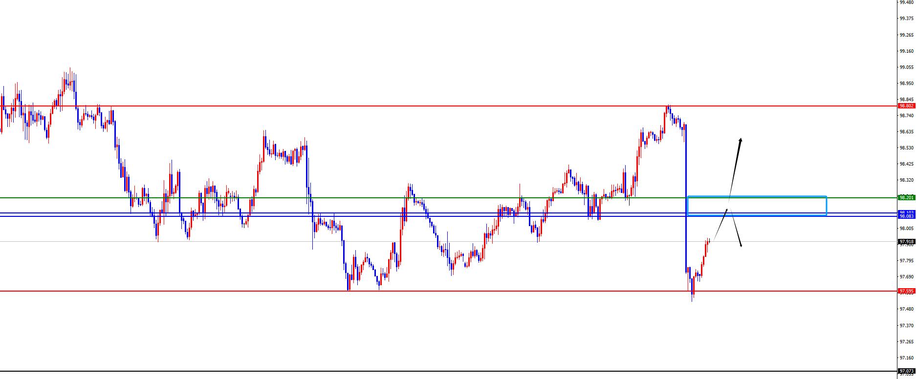 从多周期分析,周线级别来看近期价格在周线支撑上下盘整,本周重点关注98.10位置站稳,一旦站稳则中期多头将延续上行。在日线级别上,在日线上看黄金目前价格在低位持续震荡运行,虽然目前价格在日线阻力下方,但是整体还是需要关注日线阻力98.10位置得失,价格后续还是需要关注站稳表现。从四小时上看,四小时上是我们一直强调短期价格走势的关键,目前四小时阻力于98.20区域,价格在站稳此位置前先谨慎对待,待后续站稳后再关注进一步延续。从一小时上看,针对上周五大幅下跌后,目前市场有进一步向上的表现,所以对于美指的空谨慎追单,重点关注后续进一步上涨的表现。