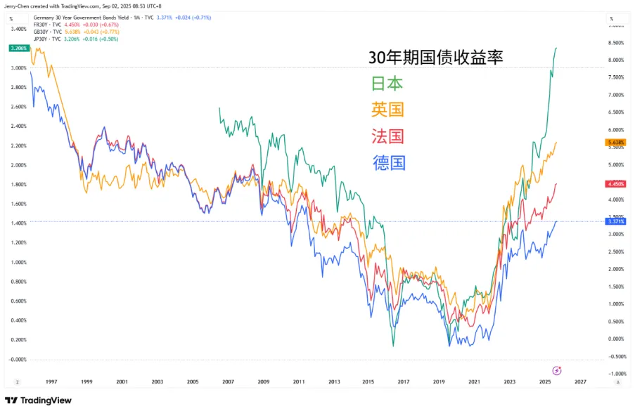 德国30年期国债收益率升至14年新高,法国30年期收益率飙升至2009年以来最高水平,英国同期限收益是刷新27年新高,日本则是创下历史新高。