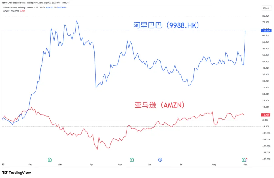 美国股市周一因劳动节假期休市,欧洲主要指数普遍上涨。在阿里巴巴(+18.5%)的利好推动下,恒生指数周一跳升2.1%。下图是阿里巴巴和亚马逊今年涨幅对比。