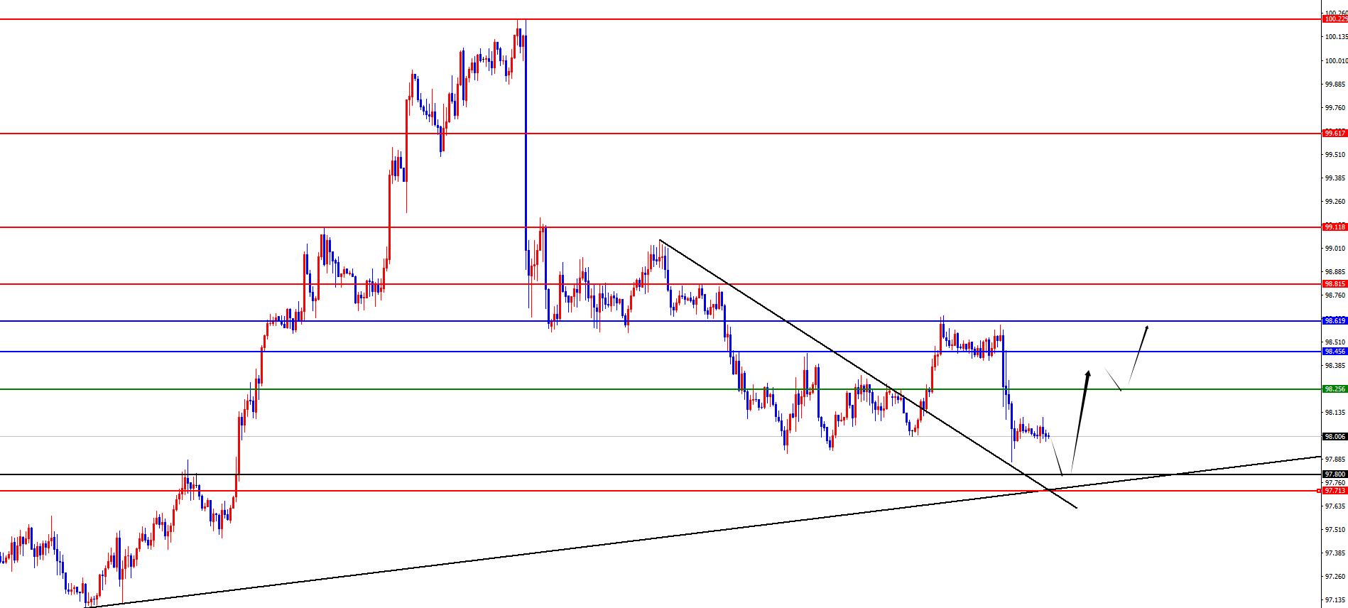 從多周期分析,週線級別來看價格在上上週突破週線阻力,隨後在上週再度下破週線支撐,近期價格在周線支撐上下盤整,本週重點關注98.50位置能否站穩是關鍵。在日線級別上,在上週三跌破日線支撐後,目前價格壓制在日線阻力98.60位置,昨日再度承壓下跌,目前波段市場偏空,但是整體我們需要關注趨勢線支撐得失。從四小時上看,四小時上是我們一直強調短期價格走勢的關鍵,昨日價格再度跌破四小時支撐位置,但是整體四小時價格更偏向於震盪,四小時阻力目前於98.25位置,所有目前暫時切勿追空,後續關注近期低點及趨勢線支撐區域。一小時上價格目前關注趨勢線支撐97.70-80區間支撐,上方關注98.25得失,後續突破再看日線及週線阻力。