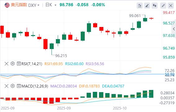週二,美元指數走強,升至逾一周高點,最終收漲0.49%,報98.59。在美國三年期國債拍賣吸引了強勁需求後,美債收益率普跌,截至目前,美元報價98.78。