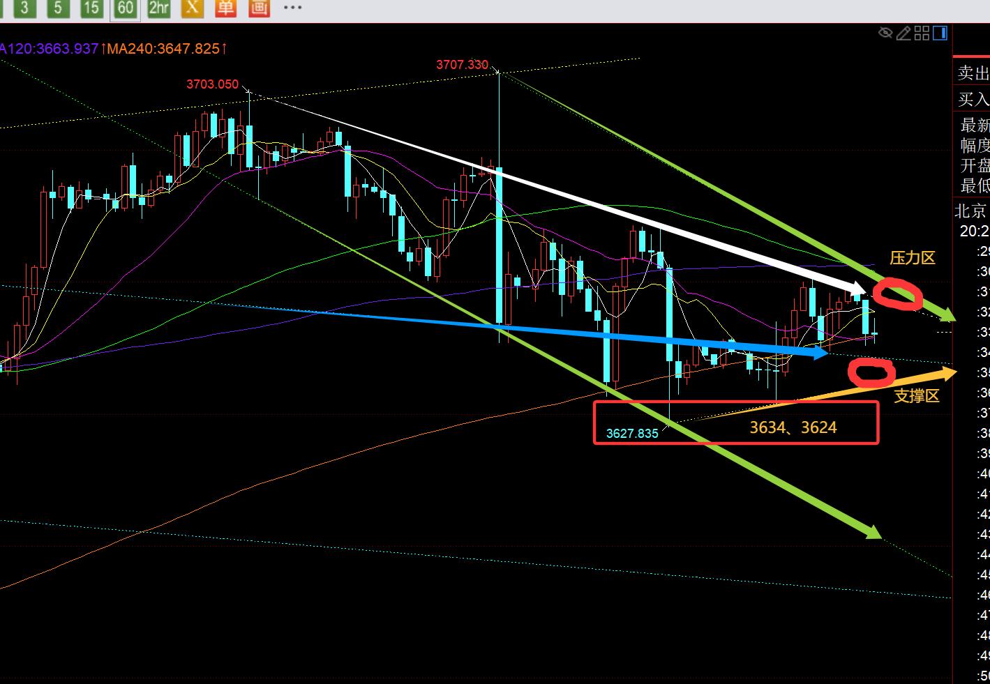 First, in terms of gold: Yesterday was a round-trip skewers, and the short-term changes in the day were rapid, Asian sessions, European sessions, and US sessions back and forth V, without continuity; Asian sessions continued to fall overnight, this is understandable, European sessions fell At 3634, the big positive immediately pulled back, which is a kind of short-selling false break in the upper track of the blue channel in the figure. Then, the European session has a strong V, piercing the Asian session high point of 3672. The US session tried to see the second continuous upward trend, and then V back to break the new low again. This was indeed unexpected; it also only pierced the European session low point of 3634, so the oscillation in the second half of the night and stabilized at 3634, and you can try to see a wave of pull-up, and test the highest 3660 line;