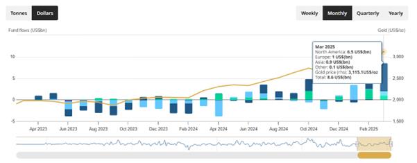 ▲ XM ClaraGli afflussi di oro netti sono stati di 8,6 miliardi di dollari, con un afflusso netto totale di 21 miliardi di dollari nel primo trimestre, raggiungendo il secondo livello più alto della storia, secondo solo a $ 24 miliardi nel periodo speciale nel 2020. Di tutti gli afflussi di capitali, il Nord America ha rappresentato il 61%, seguito dal 22% in Europa e nel 16% in Asia. Si può vedere che la principale forza trainante per questo giro d'oro proviene ancora dai mercati europei e americani. A giudicare dall'attuale aumento dell'oro, gli afflussi di capitali ETF ad aprile possono raggiungere il massimo storico.