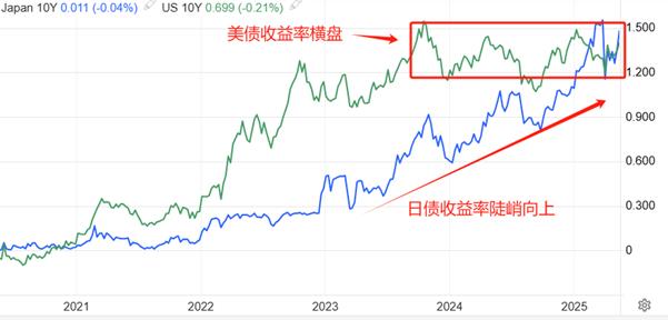 trend ". Sejak Februari tahun lepas, Bank of Japan telah menaikkan kadar faedah tiga kali, dengan kadar faedah penanda aras meningkat daripada -0.1% hingga 0.5%, peningkatan 60 mata asas. Hasil bon perbendaharaan Jepun juga terus meningkat dengan kadar kenaikan kadar faedah, dengan hasil 1.48% pada bon sepuluh tahun Jepun, yang berada pada tahap yang agak tinggi sejak kontrak disenaraikan. Sebaliknya, Rizab Persekutuan berada dalam kitaran pemotongan kadar faedah, dan hasil Perbendaharaan AS juga mempunyai ciri teratas jangka sederhana, dengan trend sisi yang signifikan dalam dua tahun yang lalu. Perbezaan hasil bon antara Jepun dan pasaran saham AS adalah daya penggerak teras untuk penghargaan yen.