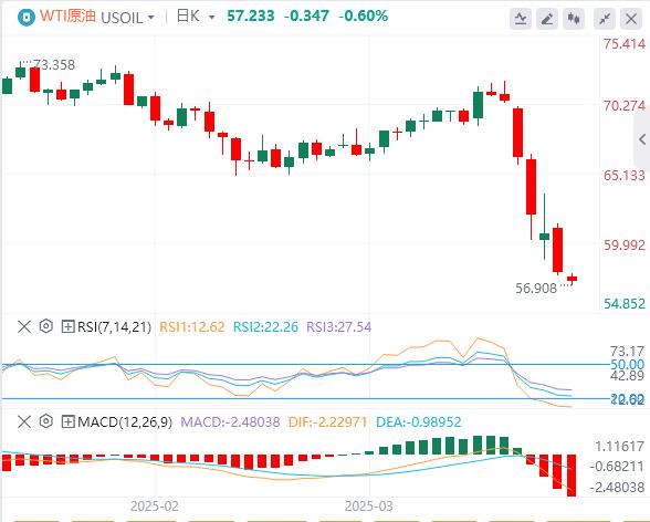Pada hari Rabu, perdagangan minyak mentah adalah sekitar 57.23. Harga minyak mentah antarabangsa jatuh dengan ketara. Walaupun pemulihan di pasaran saham global, kebimbangan mengenai kemelesetan global yang disebabkan oleh peningkatan konflik perdagangan Sino-AS yang menguasai sentimen pasaran, menyebabkan harga minyak jatuh ke tahap terendah dalam empat tahun. Menurut pegawai White House, Amerika Syarikat akan mengenakan 104% tarif ke atas barangan yang diimport dari China dari awal hari Rabu kerana China tidak menarik balik 34% kaunter tarif sebelum tarikh akhir tengah hari Trump yang ditetapkan pada hari Selasa.