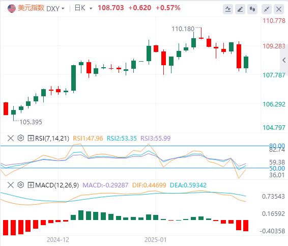 1月21日,北京时间周二亚市早盘,美元指数徘徊在108.70附近。周一,因特朗普并未在演讲中扬言要征收更高的关税,美元指数日内大跌超1%,失守109关口并跌至108关口附近,最终收跌1.22%,报108.08。美债市场因马丁路德金纪念日休市一日。现货黄金在亚盘小幅上涨,但随后陷入区间震荡,最终收涨0.16%,报2707.14美元/盎司。现货白银最终收涨0.47%,报30.47美元/盎司。由于特朗普承诺提高美国原油产量,同时推迟可能限制供应和损害需求的关税,两油跌超1%。WTI原油在美盘前短线跳水,并一度跌至75美元附近,最终收跌1.43%,报76.19美元/桶;布伦特原油收跌1.09%,报79.09美元/桶。