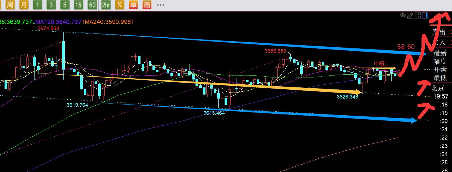 第四,黄金小时线级别:今日早间先出现了一波连跌,失守66日均线3640,原本想等待3622-20前期支撑企稳去继续看涨,也借用头肩底形态稳定支撑去发力上攻;但可惜只给到3626,然后通过通道图分析,见上图,的确蓝色平行整理通道的中轴位置,也存在一条黄色趋势线,低点刚好就是3626;随后欧盘就陷入了窄幅整理,高点反复试探中轨,但又暂时无法有效突破站上,低点又逐步慢上移,形成倒三角形态,这种一般10米左右波动,适合来回刷,而这两年擅长抓趋势波段的我来讲,就不太喜欢做这种来回小行情,短线要入手,至少空间要看到20-30米,那样才能有效把握住至少10米利润,而欧盘走势总共空间才10米上下,没有很好的操作价值,不如就看戏,耐心等待中轨有效上破站稳之后,那么就可以回踩确认尝试跟随一波拉升,去冲破图中蓝色通道上轨,3658-3660阻力位一旦拿下,历史新高也就容易被刷新,这样也有了波段的利润空间;因此,等中轨大阳收盘有效站上或连阳收盘站上,都属于有效突破,届时再找位置跟随看涨;或者你若胆大的,等3660-58突破站上后,也可以跟随看涨;若真的中轨持续压制不上,那等黄色通道或蓝色通道下轨企稳去看涨;