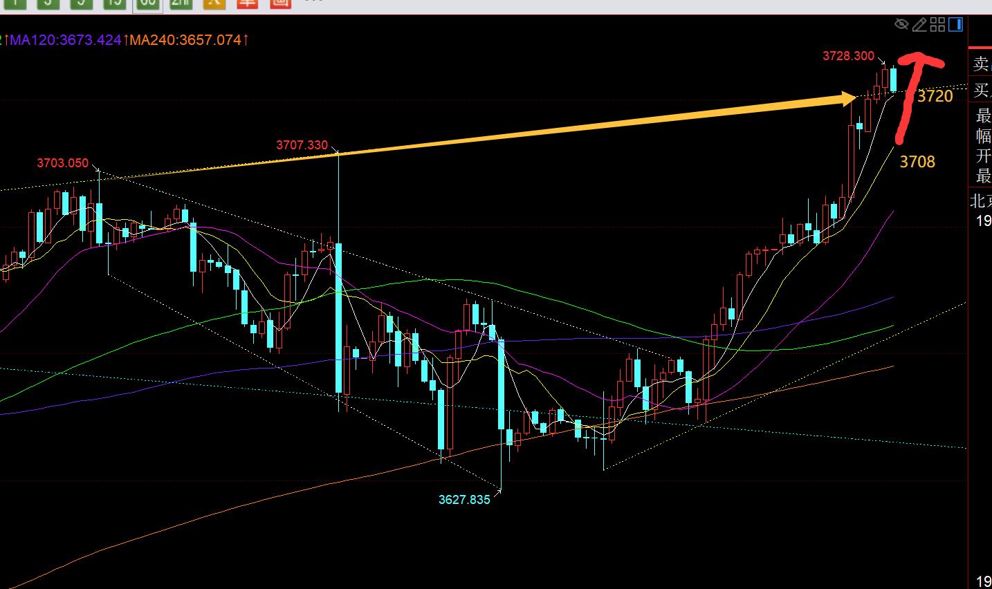 第一,黄金日线级别:对于周线和月线中长期的解读思路可以查看周视频;上周五收报饱满大阳,今日势必是继续延续看涨,本还想着能依托5均线3672之上去跟随看涨,再不济早间3680凌晨低点支撑去强势看续涨,结果都未给到机会;直接依托3685发力,亚欧盘持续单边拉升,目前又形成了一根大阳,今日基本收阳问题不大,如果还是饱满大阳,那么明日还会继续冲一下;预计国庆之前走势会维持一轮单边上涨,国庆前后谨防出现一波回调,国庆快结束前后再企稳继续走单边上拉,参考去年的走法;那么本周冲击3783其中一个长线目标就是大概率,预计靠近3800整数关口之下依旧会出现一轮修正,或缓慢震荡下跌或还是高位横盘;从当前形态看,3707前高都已具备顶底支撑,日内只要拉低给机会,都可继续顺势看涨,不要去猜顶,趋势多头下,顶都是用来突破的,并非压制;只有大消息面改变,技术上才可能逐步出现所谓的顶,但至少是明年再说;