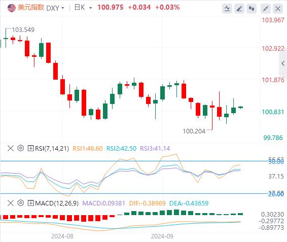 美元指数:截止发稿,美元指数交投于100.97附近。尽管PMI数据疲软,但美元周一仍保持稳定。市场继续转向温和的美联储,预计到年底将放宽75个基点。交易员将密切关注美联储的评论,以及新数据是否能证明降息50或75个基点是合理的。在市场重新定价美联储预期之前,美元可能仍然脆弱。传入数据将是关键。本交易日经济数据相对较少,投资者留意澳洲联储利率决议、美国9月谘商会消费者信心指数、美联储官员讲话,关注地缘局势相关消息。技术面上,美元指数试图收于101.00水平上方,但未能获得动力并回落。如果美元指数跌破100.80水平,它将朝着下一个支撑位99.55–99.75迈进。