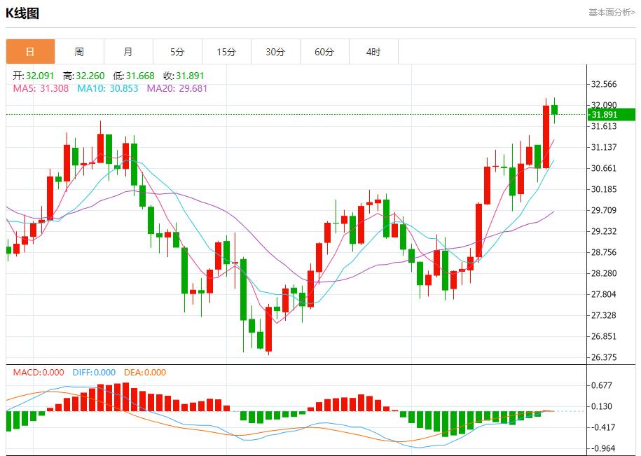现货白银:截止北京时间20:28,现货白银下跌,现报31.882,跌幅0.60%。纽市盘前,白银价格以明显的利空交易至32.00美元下方,而只要31.00美元水平保持不变,主要的看涨趋势仍然活跃,等待收集积极的动力,以帮助推动价格恢复看涨趋势,其目标从32.50美元开始,并延伸至33.00美元,作为下一个主站。