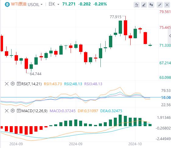 周二亚盘,原油交投71.27附近。由于对中国经济数据疲软和不确定刺激计划的担忧主导了市场情绪,原油价格几乎抹去了上周的所有涨幅。与此同时,地缘政治风险继续挥之不去,因为交易员仍然担心以色列对伊朗最近导弹袭击的反应可能会中断石油生产。尽管美国已警告以色列不要以伊朗能源基础设施为目标,但任何升级仍可能影响供应,从而为价格提供一些临时支撑。然而,就目前而言,中国经济不确定性的重量掩盖了这些地缘政治风险。
