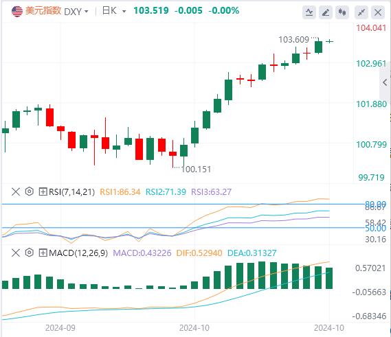 10月17日,北京时间周四亚市早盘,美元指数徘徊在103.51附近。周四,因投资者排除了美联储在下次政策会议上大幅降息的可能,并消化特朗普可能赢得大选的可能性,美元指数创下11周新高,最终收涨0.29%,报103.52。基准的10年期美债收益率收报4.0180%;对货币政策更敏感的两年期美债收益率收报3.9500%。因美债收益率疲软、主要央行降息预期和持续的地缘政治冲突提供的避险需求,现货黄金周四逼近历史高位,最高触及2685.41,最终收涨0.43%,报2673.70美元/盎司。现货白银最终收涨0.62%,报31.67美元/盎司。受累于石油需求增长将放缓的预测,油价周四维持在两周低位附近。WTI原油最终收跌0.49%,报70.61美元/桶;布伦特原油收跌0.31%,报74.41美元/桶。
