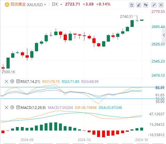周二亚盘,黄金交投于2723.71附近。黄金价格在周一的北美交易时段再创历史新高,但在美国国债收益率上升和美元走强的情况下,黄金价格暂停了涨势。在过去五个交易日,中东的紧张局势和美国(US)总统大选的不确定性增加了流向避险资产的资金。在美国大选势均力敌的情况下,市场情绪发生了负面变化。路透社透露,副总统卡马拉·哈里斯在普选投票中领先前总统唐纳德·特朗普45%对42%。但是,获胜者将由选举人团的各州结果决定。