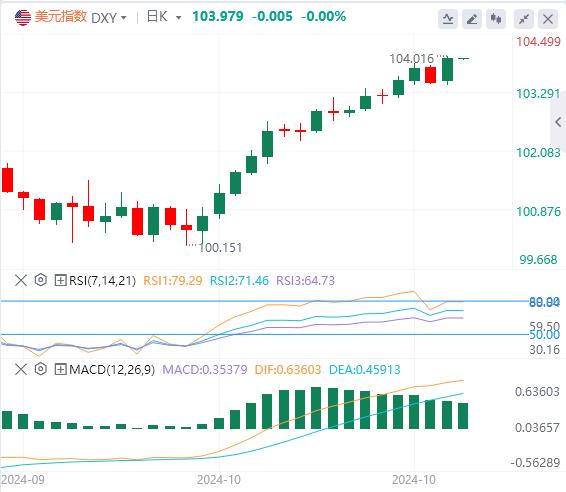10月22日,北京时间周二亚市早盘,美元指数徘徊在103.97附近。周一,美元指数在美盘前大幅上涨,并一度冲上104关口上方,但未能站稳此处,最终收张0.5%,报103.98。基准的10年期美债收益率收报4.2060%;对货币政策更敏感的两年期美债收益率收报4.0420%。现货黄金盘中一度站上2740美元/盎司,再创纪录新高,但因美元和美债收益率走高,其在美盘https://xn--xm-5s9cx14e.com回吐日内全部涨幅,较日高一度大跌20美元,最终收跌0.07%,报2719.82美元/盎司。现货白银收涨0.17%,报33.77美元/盎司。因中东地区战事持续升级,原油小幅反弹,WTI原油在美盘时段一度站上70美元关口上方,但未能站稳此处,最终收涨1.32%,报69.70美元/桶;布伦特原油收涨1.13%,报73.69美元/桶。