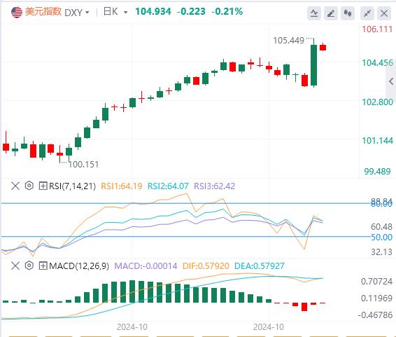 特朗普再次当选总统,美元指数上行,截至目前,美元指数报价104.93.
