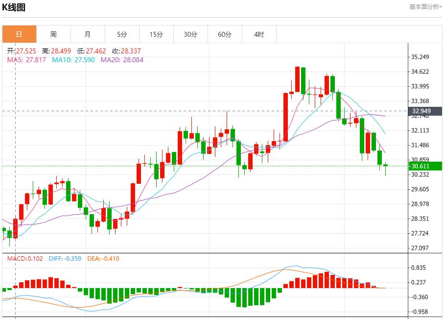 现货白银:截止北京时间21:20,现货白银下跌,现报30.600,跌幅0.20%。纽市盘前,白银价格显示出新的负面交易,以恢复修正的熊市轨道,实现我们下一个等待的目标29.64美元的道路是开放的,注意到打破它将推动价格遭受更多损失,延伸到28.40美元,而熊市波的持续取决于价格稳定在30.63美元以下,最重要的是在31.63美元以下。