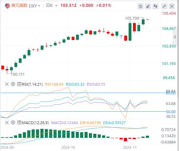 11月12日,北京时间周二亚市早盘,美元指数徘徊在10551附近。周一,美元指数再创四个月新高,盘中最高触及105.709,最终收涨0.524%,报105.5。美国https://xn--xm-5s9cx14e.com债市因退伍军人节休市一日。在美元持续反弹和投资者继续获利了结的压力下,现货黄金日内重挫65美元,一度逼近2610美元关口,最终收跌2.39%,报2619.53美元/盎司。现货白银最终收跌1.91%,报30.69美元/盎司。鉴于黎以停火的希望和强美元的施压,国际原油继续回调。WTI原油最终收跌3.12%,报68.04美元/桶;布伦特原油收跌2.72%,报71.83美元/桶。美国天然气期货日内暴涨9%;路易斯安那州亨利中心基准天然气现货价格暴跌至25年来的最低点。