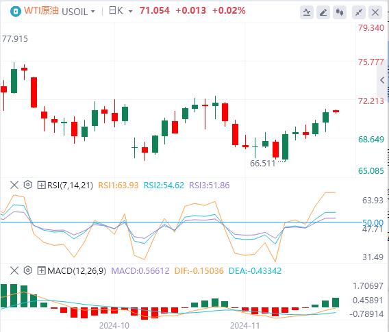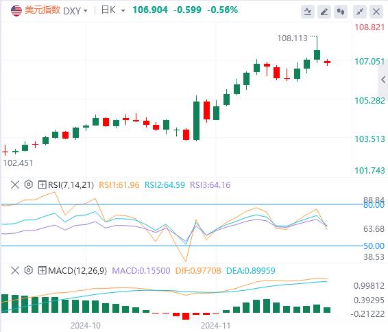 11月25日,北京时间周一亚市早盘,美元指数徘徊在106.90附近。上周五,因市场普遍认为特朗普上台将提振美元,而美联储明年降息预期的削弱进一步支撑美元走势,美元指数一度冲上108关口上方,接近13个月高点,为2022年11月以来首次,最终美元指数收涨0.43%,报107.49。基准的10年期美债收益率收报4.4410%;对货币政策更敏感的两年期美债收益率收报4.3840%。因俄乌冲突的不确定性加剧,现货黄金连续五个交易日上涨,最终收涨1.74%,报2715.81美元/盎司,创下2023年3月以来最佳单周表现。现货白银最终收涨1.77%,报31.33美元/盎司。据悉OPEC+可能在12月宣布推迟增产,国际油价上涨。WTI原油最终收涨1.48%,报71.12美元/桶;布伦特原油收涨1.08%,报75.05美元/桶。