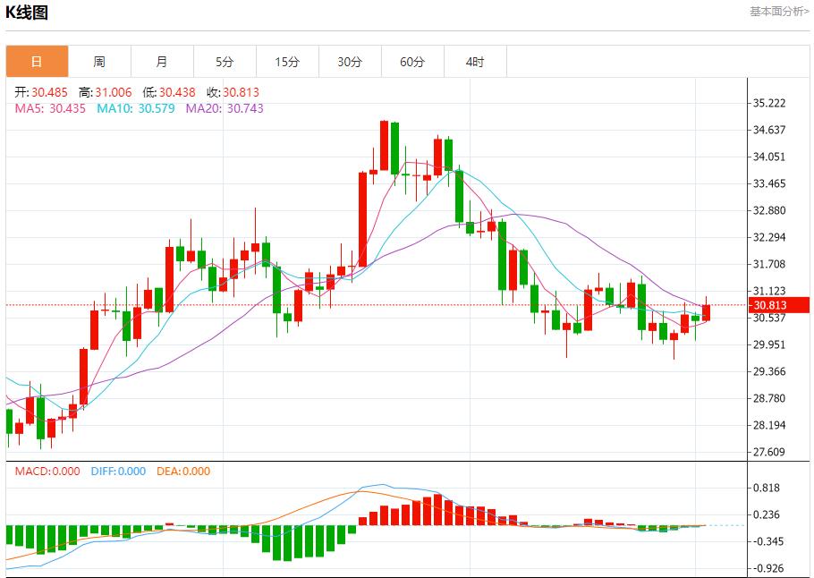 现货白银:截止北京时间21:27,现货白银上涨,现报30.81,涨幅1.08%。纽市盘前,白银价格明显突破30.63美元水平,并在过去四个小时内收于其上,并在当天剩余时间内转向上涨,并朝着达到31.63美元的收益方向前进,作为下一个主要站。
