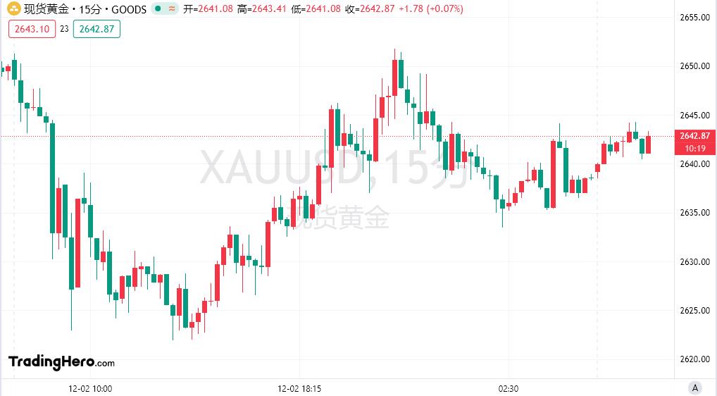 周二亚盘,黄金交投于2642.87附近。现货黄金震荡微涨,金价周一下滑0.44%,收报2638.69美元/盎司,结束了四日连涨的势头,因法国政治危机升级,美元大幅反弹,不过,法国局势也给金价提供一些避险支撑,另外,多位美联储官员认为美联储将进一步降息,市场对美联储12月降息预期升温,仍给金价提供支撑。投资者在等待更多关键的经济数据和美联储利率走势线索。