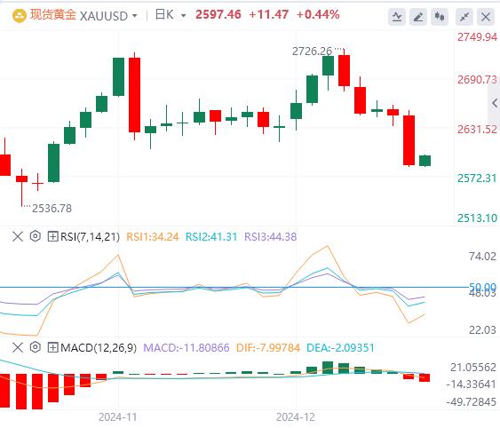 周三亚盘,黄金交投于2597.46附近。由于美联储主席杰罗姆鲍威尔在美国央行决定降息后采取立场,金价暴跌。预测表明,美联储的鸽派立场有所减少。美联储主席杰罗姆·鲍威尔(JeromePowell)表示,央行可能会对未来的政策调整采取更谨慎的态度,并指出目前的措施限制较少。他强调,通胀风险和不确定性仍然向上倾斜,这在一定程度上解释了点阵图的变化。