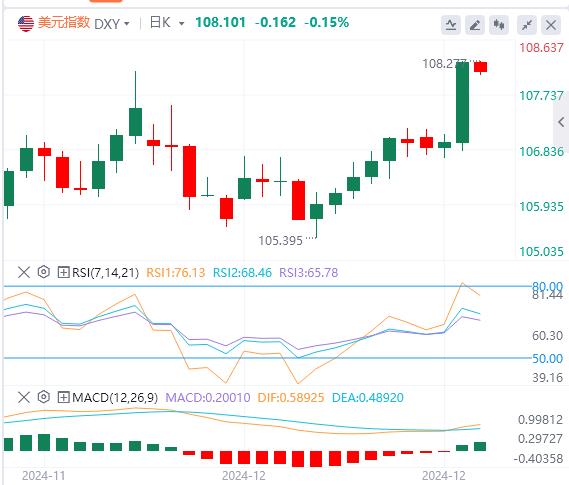 12月19日,北京时间周四亚市早盘,美元指数徘徊在108.10附近。周三,美联储意外将明年降息预期砍半,美元指数暴力拉升120点,最终收涨1.228%,报108.26,刷新2022年11月以来新高。美债收益率集体攀升,两年期美债收益率收报4.363%,10年期美债收益率收报4.519%,日内均涨超10个基点。现货黄金盘中跳水,xn--xm-5s9cx14e.com美联储决议公布后累跌逾50美元,失守2590美元关口,最终收跌2.3%,报2585.78美元/盎司,创一个月新低。现货白银随之重挫,最终收跌3.85%,报29.36美元/盎司,创三个月新低。尽管美国原油库存下降显示了需求韧性,但美联储暗示放缓降息步伐打压了乐观情绪,两油连续第三个交易日走低。WTI原油最终收跌0.62%,报69.36美元/桶;布伦特原油收跌0.63%,报72.59美元/桶。