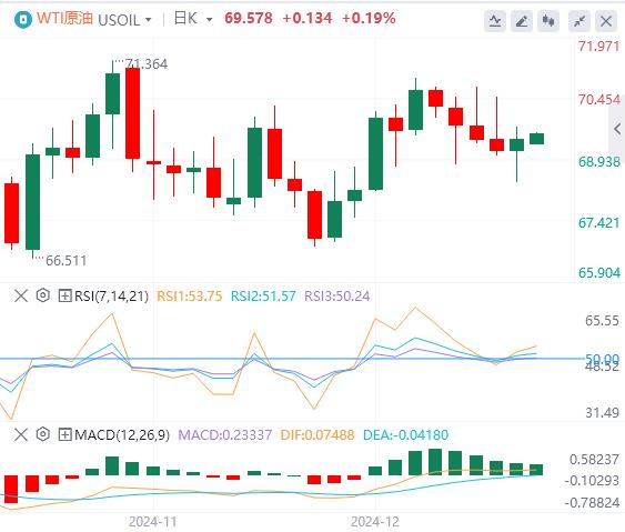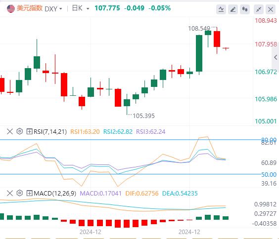 12月23日,北京时间周一亚市早盘,美元指数徘徊在107.77附近。上周五,由于美联储最爱的通胀指标降温令降息预期回温,美元指数从两年高位回落,最终收跌0.543%,报107.83,但仍连续第三周上涨。美债收益率全线走软,两年期美债收益率收报4.317%,10年期美债收益率收报4.519%。现货黄金在美国PCE数据公布后扩大涨幅,一度站上2630美元关口,随后有所回落,最终收涨1.01%,报2620.79美元/盎司。现货白银跟随黄金反弹,最终收涨1.62%,报29.51美元/盎司。受美元走软的支撑,加上特朗普要挟欧盟购买美国油气,国际原油盘中跌超1%后转涨。WTI原油最终收涨0.38%,报69.48美元/桶;布伦特原油收涨0.47%,报72.6https://xn--xm-5s9cx14e.com5美元/桶。