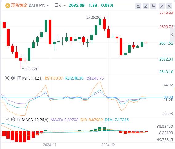 周五亚盘,黄金交投于2632.04附近。周四黄金价格上涨,受圣诞假期后清淡交投中避险需求的推动,市场正在等待特朗普政府上台后美国经济的表现,以及美联储2025年的利率策略。美国总统乔·拜登周三表示,他谴责俄罗斯在圣诞节当天对乌克兰部分城市及其能源系统发动袭击,并要求美国国防部继续向乌克兰增加武器运送。