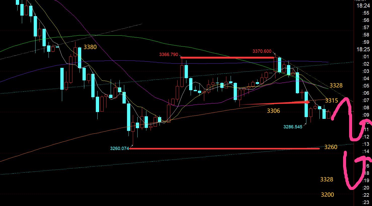 第一,黃金方面:這一周下來,只有昨日佈局失敗,日內走的也相對揪心;原本前日隔夜弱勢收盤,第二天早間先拉升則要試探繼續壓制看跌,選擇的位置是3338一線,即昨日跌幅反抽618分割阻力,也是頂底轉換位置,同時是日線趨勢線反壓點,多重共振,較好的參考點,結果一早的持續拉升力度超預期,越過3338,衝擊3366一線;然後計劃等3380一線前日高點去繼續嘗試看跌,卻不給機會;當午後衝高回落,重新打回反壓線之下,則提示3334、3345分批看跌,3345差兩三美金未觸及,3334麼持倉七八個小時,一直無法很好下跌,美盤前保守選擇了小賺出局,結果沒多久,迎來30美金下挫;小時線大陰下破,則尾盤再跟隨一次短線看跌,依托618分割阻力3330下,結果目標差2美金未給到,後半夜慢慢震盪洗盤走高;