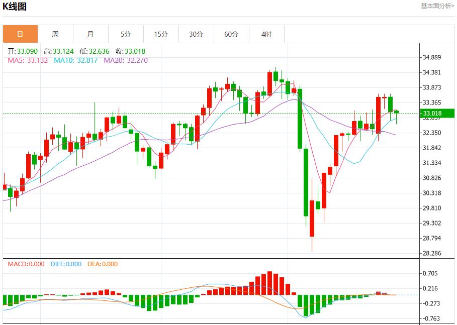 現貨白銀:截止北京時間20:20,現貨白銀下跌,現報33.005,跌幅0.15%。紐市盤前,在依靠EMA50的支撐後,白銀價格在最近的盤中交易中獲得了一些支撐,開始在(RSI)上形成正背離,在達到與價格走勢相比誇張的超賣水平後,隨著積極信號的出現,這有助於價格在盤中水平上上漲,利用這一勢頭,受短期基礎上打破看漲修正趨勢線的影響。