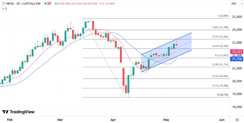 XM港股:央行公佈一系列穩定市場政策,推出十招支持經濟,包括將下調存款準備金率0.5個百分點,加上國務院副總理將訪問瑞士並與美國財長會談,市場憧憬關稅戰有望緩和,恆指延續過去4日的升勢,今早高開507點。恆指半日昇111點或0.5%,午後續升逾百點。