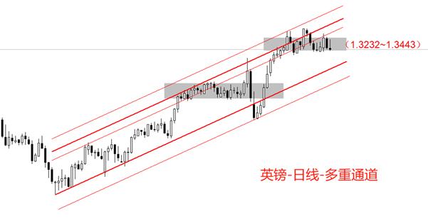 走勢結構角度看,日線級別,GBPUSD處於顯著多頭趨勢之中。 1月13日至今形成的多重通道,對於當前行情的發展仍有限製作用。限製作用最強的通道線如圖中更粗的紅色線。 4月21日至今,GBPUSD進入窄幅震盪通道,上限1.3443,下限1.3232,區間211基點。從上一輪的震盪走勢看,震盪結束之前,可能出現破壞性的劇烈下跌和上漲波段。所以,當前的震盪走勢有可能下破1.3232,但只要處於多重通道以內,就不會破壞多頭趨勢結構。