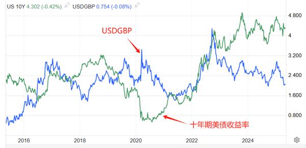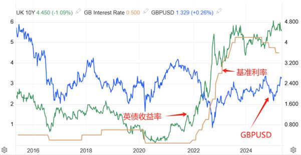 上圖是英央行基準利率、英國10年期國債收益率、GBPUSD的日線走勢圖的疊加。英央行基準利率和英國10年期國債收益率呈現出長周期的顯著共振性,不過,在中短期,兩者偶有背離走勢。比如2024年9月份至今,英國央行維持降息態勢,但十年期英債收益率卻不斷走高。 GBPUSD的走勢與十年期英債收益率也有共振特徵,但這種共振性會在某一段時間遭到破壞。比如2021年8月至2022年9月份,十年期英債收益率不斷升高,而GBPUSD持續下跌,兩者顯著背離。