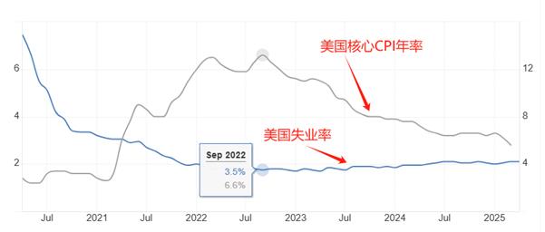 從美國核心CPI年率和失業率數據的疊加圖來看,2022年9月份之後,美國的高通脹問題不斷緩解,失業率雖有所升高但絕對值處於健康水平。 3月份美國核心CPI年率為2.8%,跌破3%關口,意味著高通脹想像基本結束。並且,美聯儲是在沒有大幅提高失業率的情況下,完成的通脹率下降目標。現階段,美國的各項經濟數據均表現健康,美聯儲沒有必要調整當前的貨幣政策,除非特朗普的激進政策導緻美國的核心經濟數據出現顯著波動。