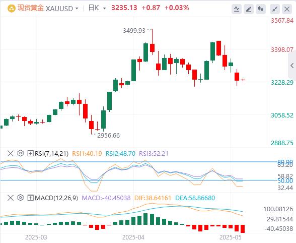 週二亞盤,黃金交投3235.13附近。金價週一下跌超過3%,此前美中周末討論後風險偏好有所改善,雙方同意降低90天的關稅。華爾街在美中協議之後取得了收益,根據該協議,兩國都降低了關稅,並同意在瑞士會晤後繼續進行進一步談判以達成貿易協議。