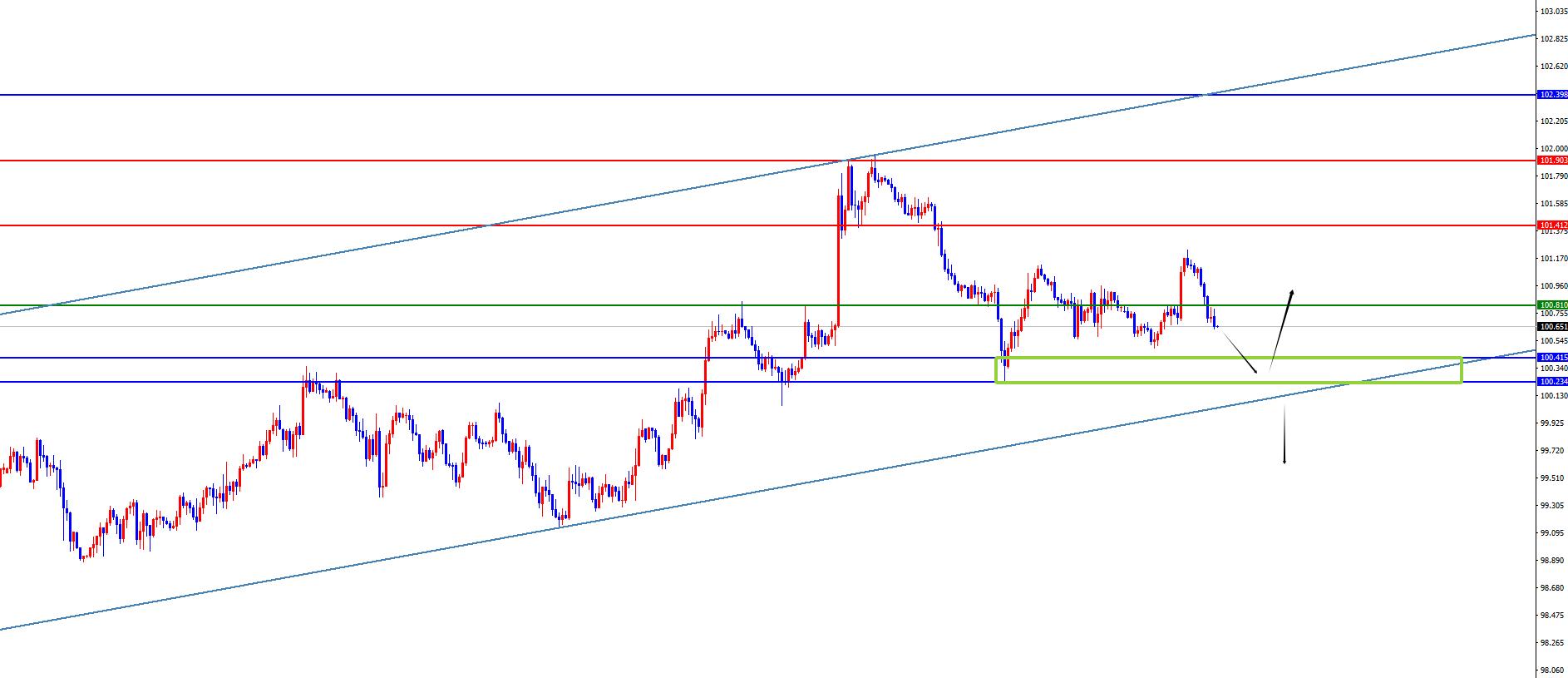 在美元指數的表現上,上週五美元指數呈現出上漲態勢。當日美元指數價格最高攀升至101.234的位置,最低則下探至100.493,最終以100.966的價格收盤。回顧上週五市場表現,在早盤期間價格短線先壓制在四小時阻力位置,之後歐盤再度發力上漲並上破四小時阻力位置,目前看後續需要關注日線支撐100.20-40分水嶺得失。從多周期分析,週線級別來看價格壓制在102.40區域阻力,那麼從中期視角出發,美元指數的走勢將更偏向於空頭。在日線級別上隨著時間的推移價格關鍵支撐位置於100.20-40區間,後續重點關注此位置得失。同時按照四小時級別看,隨著時間的推移目前四小時關鍵位置於100.80區域。一小時上有進一步承壓的表現。所以綜合分析暫時關注日線分水嶺位置得失。