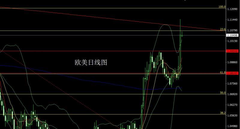 歐美市場昨日開盤在1.08519的位置後行情先回落,日線最低給到了1.08035的位https://xn--xm-5s9cx14e.com置後行情強勢拉升,日線最高觸及到了1.11475的位置後行情高位整理,日線最終收線在了1.10502的位置後行情以一根上影線長於下影線的大陽線收線,而這樣的形態收尾後,昨日1.08200的多減倉後止損跟進在1.09000,今日1.09500多止損1.09250,目標看1.10500和1.11000.