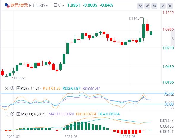 歐元/美元週五下跌近0.8%,但本週上漲約1.2%。週一早盤,該貨幣對保持在1.1000附近的積極區域。據英國《金融時報》報導,歐洲央行(ECB)政策制定者YannisStournaras週一警告稱,特朗普的關稅可能會給歐元區需求帶來巨大衝擊。當天早些時候,德國數據顯示,繼1月份報告的2%增長之後,2月份工業生產按月收縮1.3%。