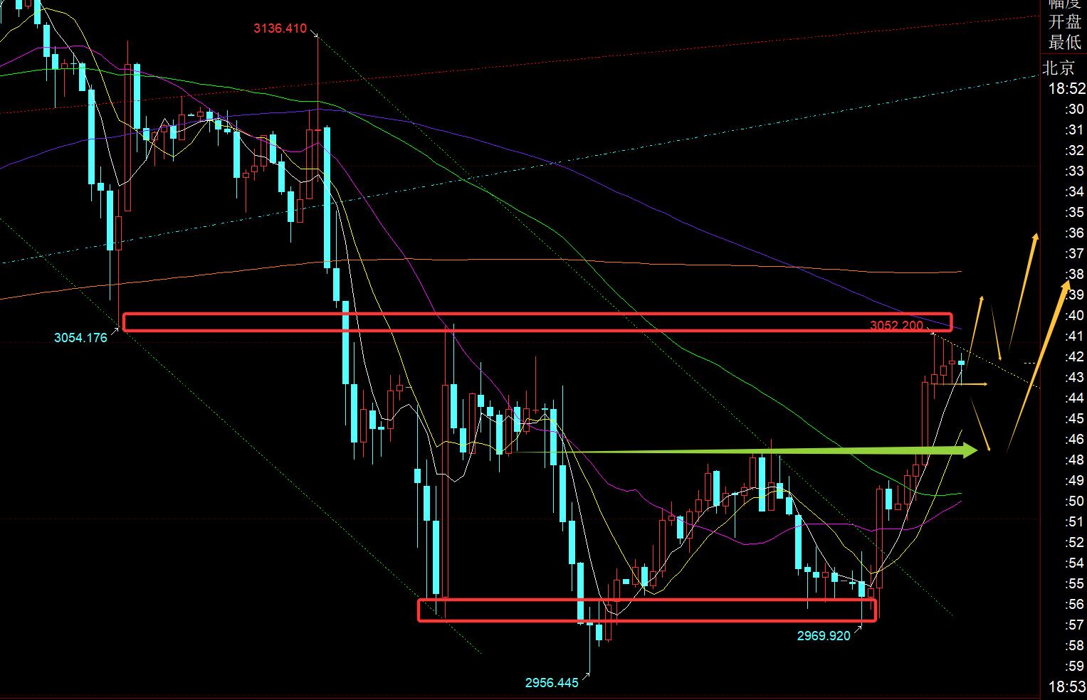 第三,黃金小時線級別:早間原本8點指出2977一線可嘗試看漲,但看到美股仍連跌弱勢,就把防守上移本錢,結果打了保護,10點直接迎來大陽反補;而一般10點形態定亞盤強弱,甚至影響歐盤,出現大陽就意味著午後容易延續拉升;觀察兩個小時一直處於3000之上不下,則不能等回測了,直接3000之上繼續看漲,最終果然突破3025,漲至3052高度;這種短期強勢逼空的走法,一旦低位沒上車,後面基本沒機會讓你上;包括美盤前這幾個小時,一直處於3038 -3050之間徘徊,下探總容易長下影,依舊很強勢,要嘗試跟隨就要膽大些,3038之上直接看漲,因為歐盤連陽破高,美盤基本會有二次拉升,無非就是先誘空再拉升,還是直接拉升的問題;因此,今晚比較簡單,先3038上直接看漲,當今晚直接續漲拉升來對待,目標3055、3062-66,強壓3086;若它沒有直接續漲,先進行誘空一波,那麼頂底位置3023-20再去嘗試看漲,也是日內回踩的382分割位置,作為短期日內小單邊,回踩就只能先看382;