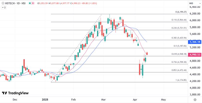 今日港股恆指和科技指數高開但漲幅收窄,科技指數半日昇2.7%至5000點上方。近期市場大幅震盪下,不同行業所遭受的影響也不同程度反映在股價上。日內電子產品相關股價集體上揚,但依然處於政策的不確定性中,特朗普表態的半導體關稅可能將未來一周公佈,在此之前的市場會保持謹慎,並隨時做好更多震蕩的準備。科技指數日內高開但漲幅收窄,如果收於10日均線下方,則留意回到4900至4700範圍內整理的可能,多餘多頭而言收復5000點關口依然是關鍵。