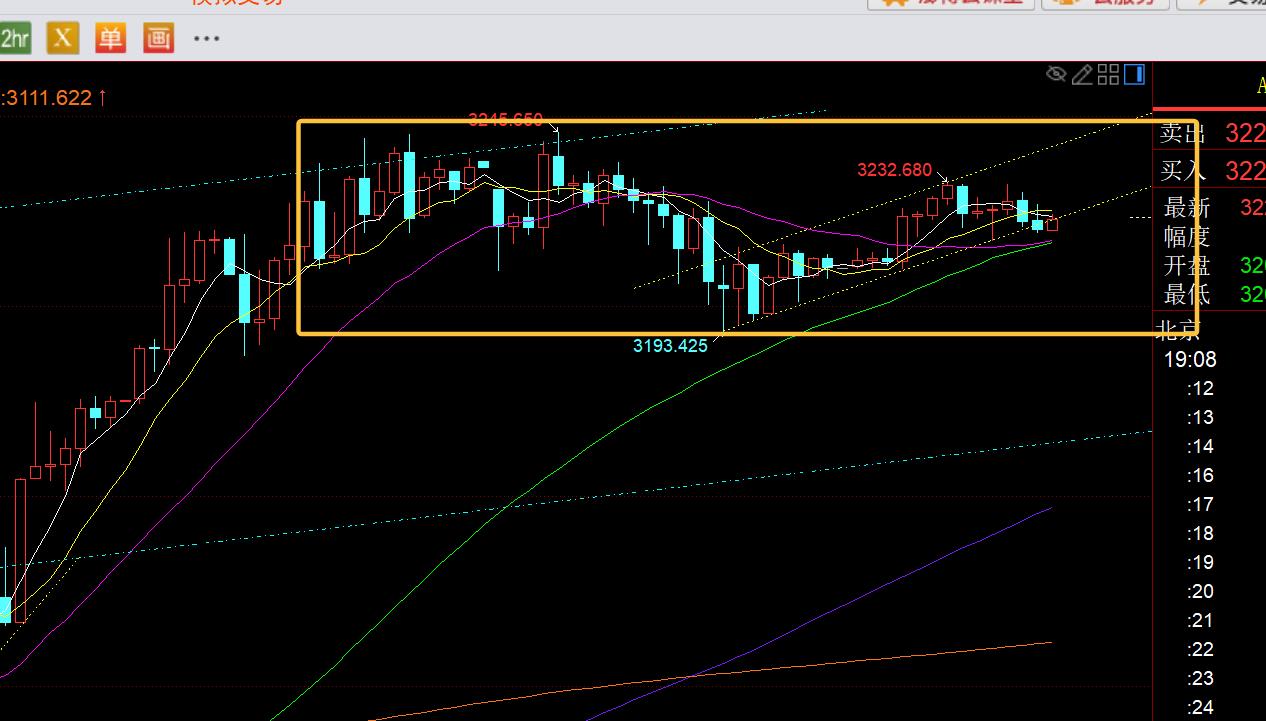第一,黃金方面:昨日早間開盤先跳空低開,由於前期處於強勢拉升格局,先低開則容易回補缺口,因此10點前後擇機看漲一波,最終成功測試關鍵通道上軌反壓點3245一線,同時此處依然壓制,進行了一波回落;只是歐美盤運行的震盪整體上走的比較顛簸,延續性差,基本破前面一個小時低點,就容易反補一波拉升,但拉升又突破不了小時線中軌,高點慢下移,尾盤最終企穩3193,收盤於3210之上;