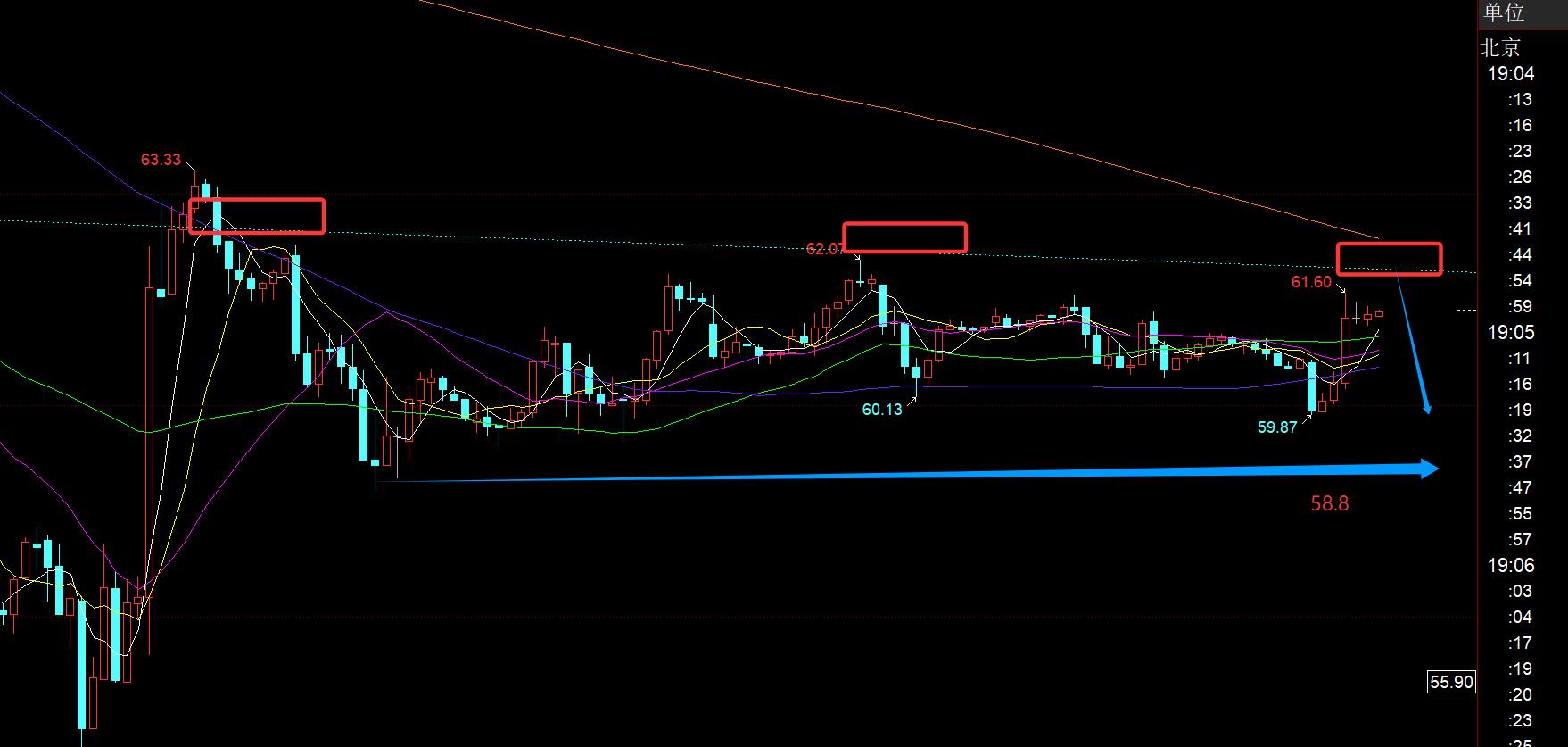 原油方面:這幾日它的波動不大,基本還處於橫盤中運行,阻力還是圖中的那條反壓線62一線,支撐58.8;若今晚依然承壓62,那麼歐盤急拉的就會怎麼跌回去;